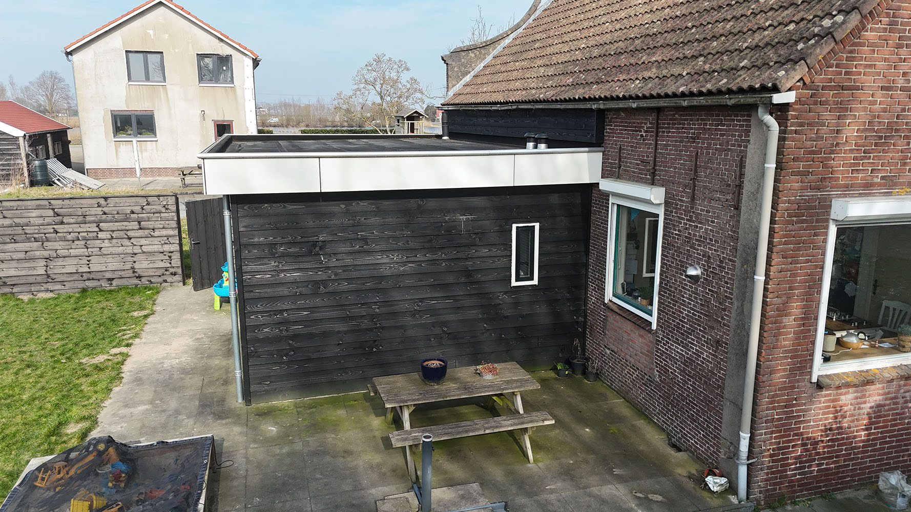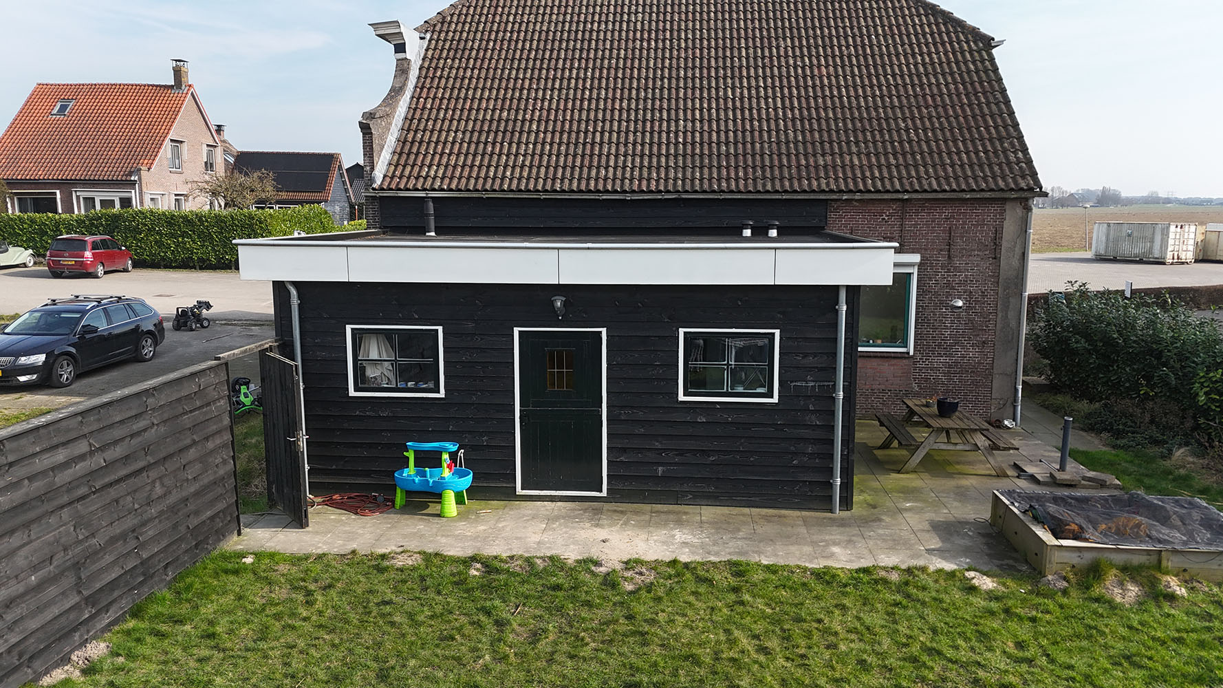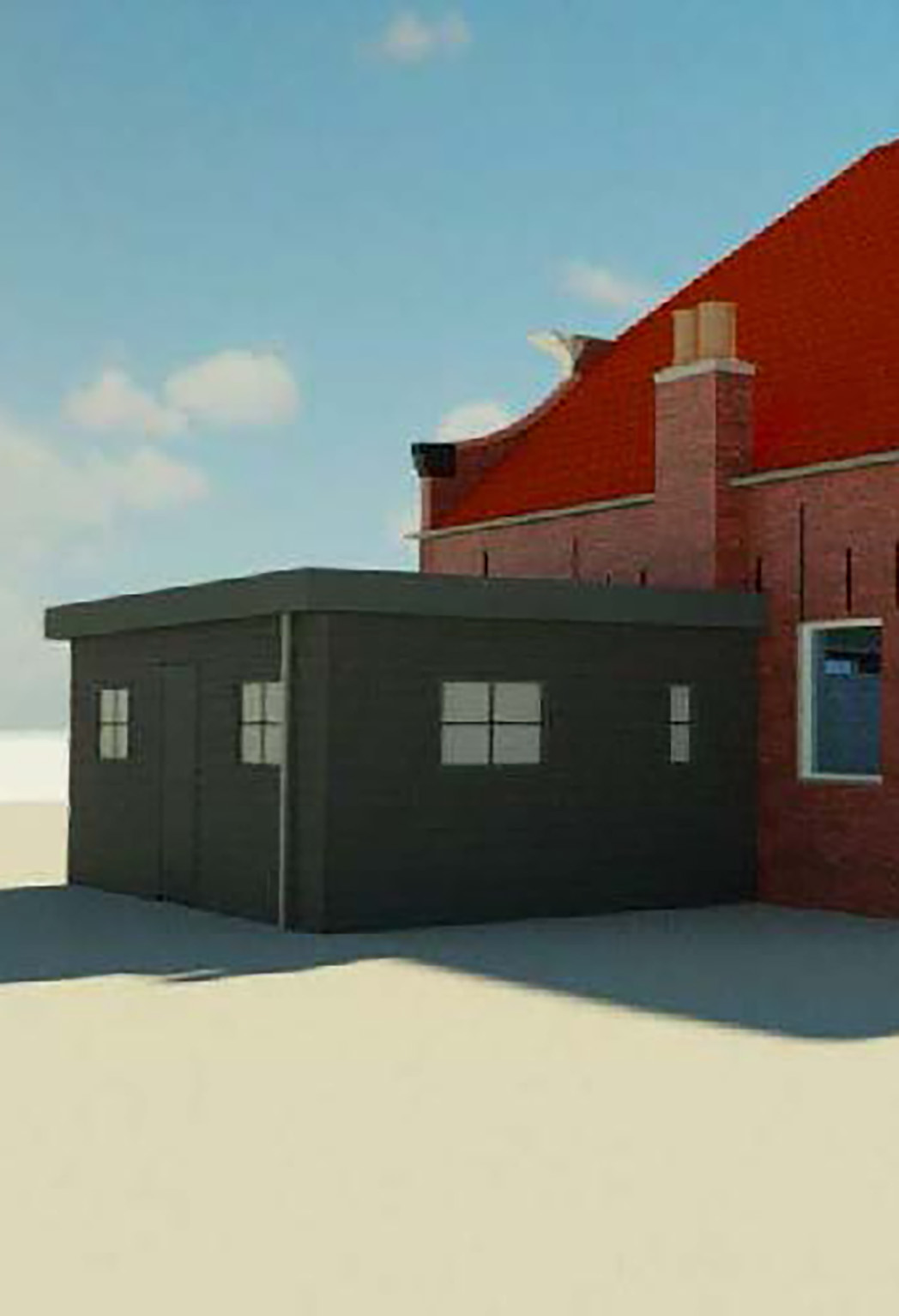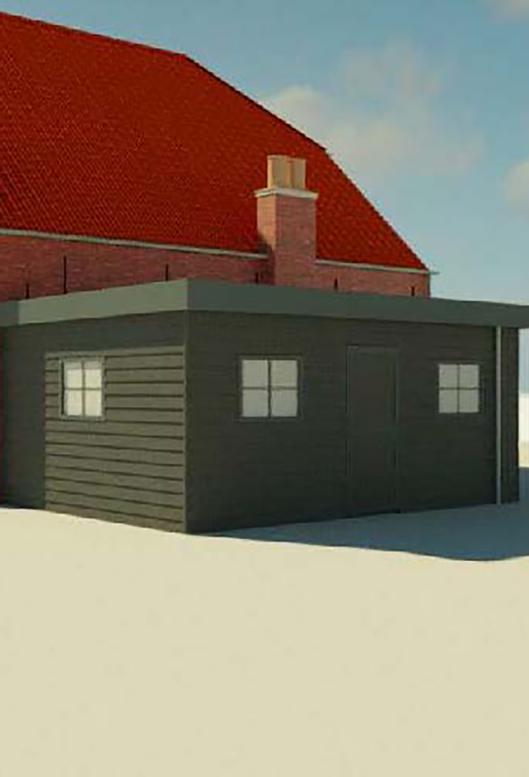 De oude schuur is gesloopt. Het voormalige tussenlid welke niet gesloopt was is echter dermate slechte staat dat een nieuw aanbouw gewenst is. Het oorspronkelijke ontwerpging uit van een aanbouw met een lessenaarsdak. In overleg met de monumentencommissie is dit een platdak aanbouw geworden bekledd met houten delen. Leidingverloop naar de verdieping is door een authentiek schoorsteen element vervangen. Het kleurenpallet is op advies in de zwart en grijstinten gehouden.