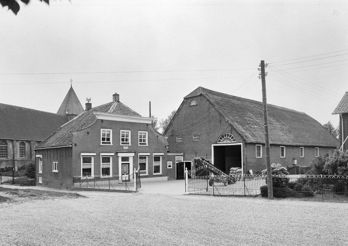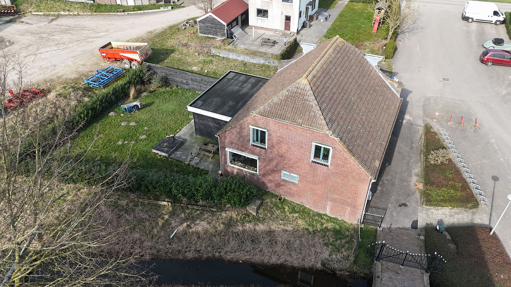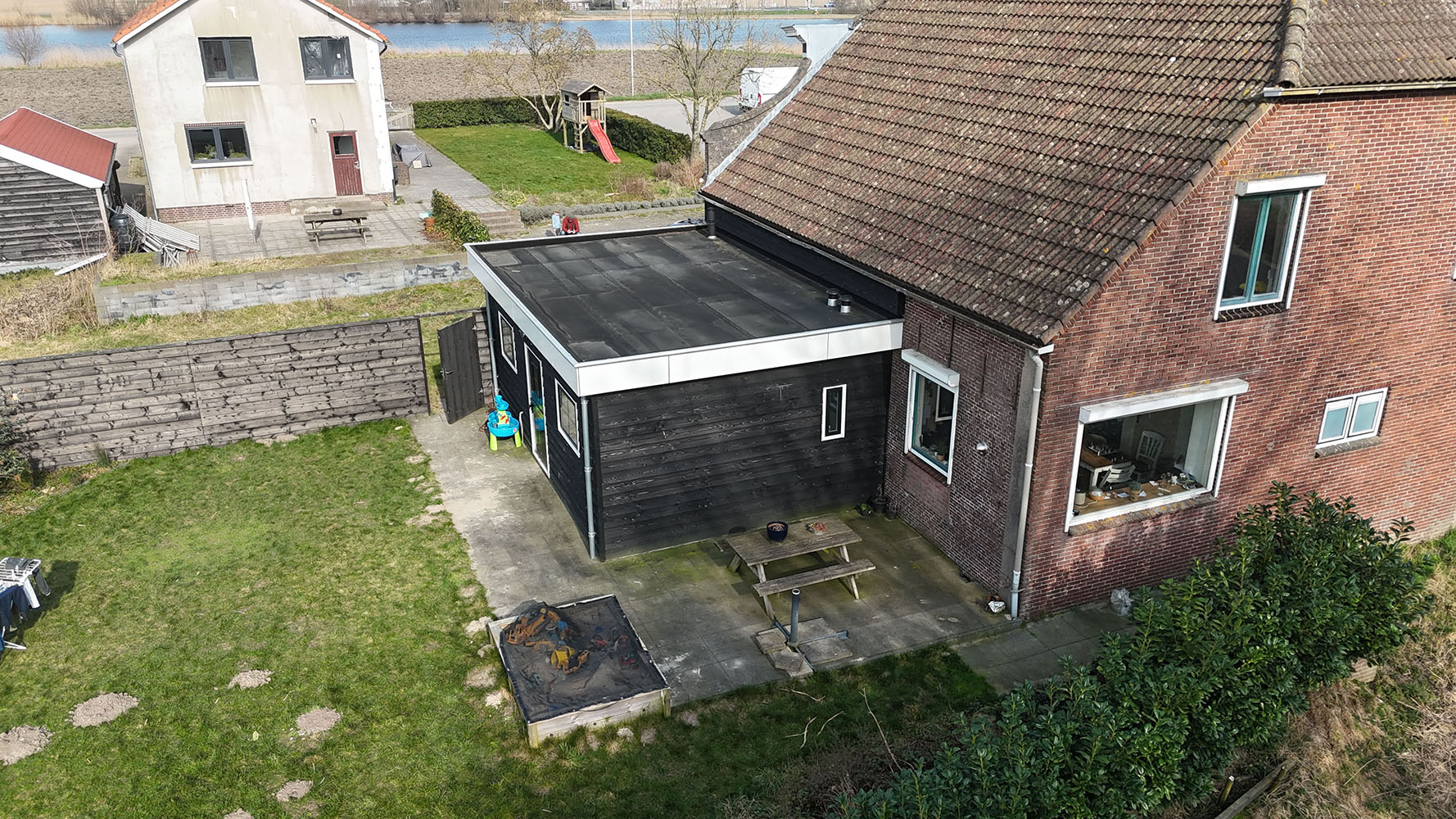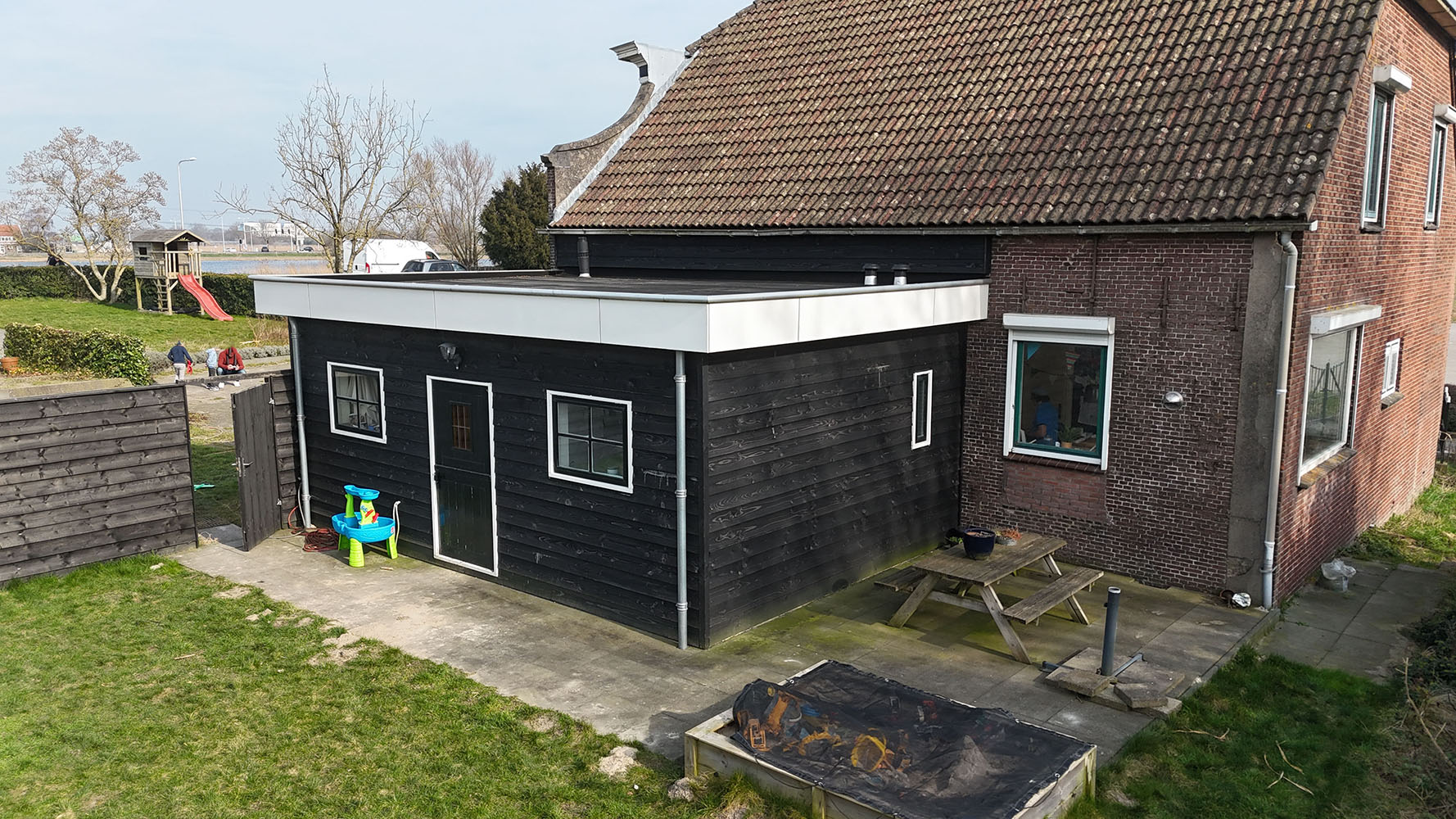 De oude schuur is gesloopt. Het voormalige tussenlid welke niet gesloopt was is echter dermate slechte staat dat een nieuw aanbouw gewenst is. Het oorspronkelijke ontwerpging uit van een aanbouw met een lessenaarsdak. In overleg met de monumentencommissie is dit een platdak aanbouw geworden bekledd met houten delen. Leidingverloop naar de verdieping is door een authentiek schoorsteen element vervangen. Het kleurenpallet is op advies in de zwart en grijstinten gehouden.