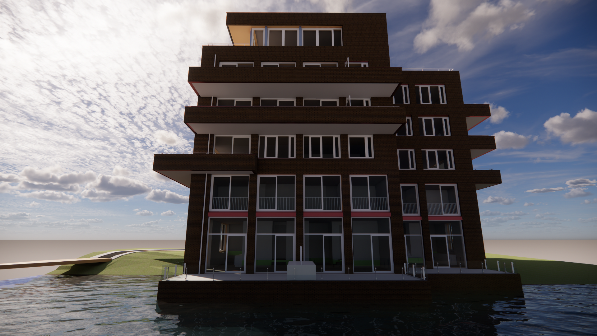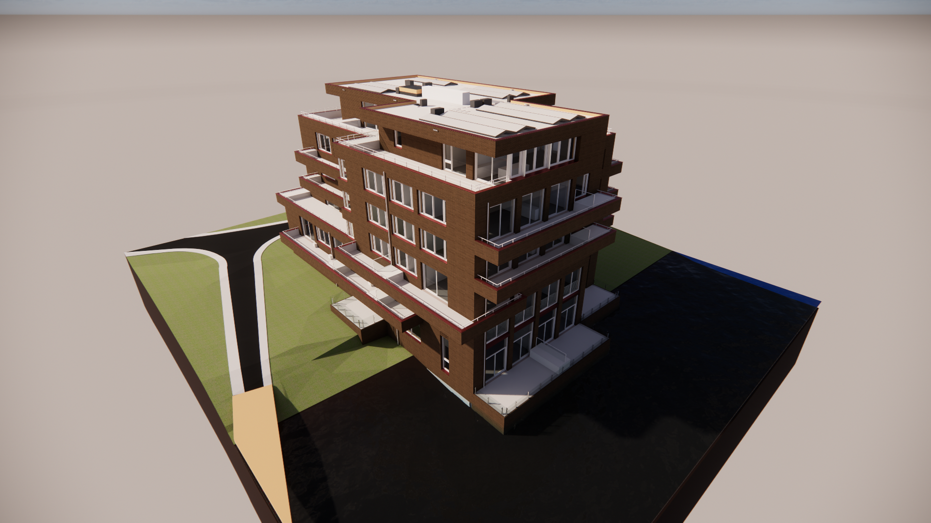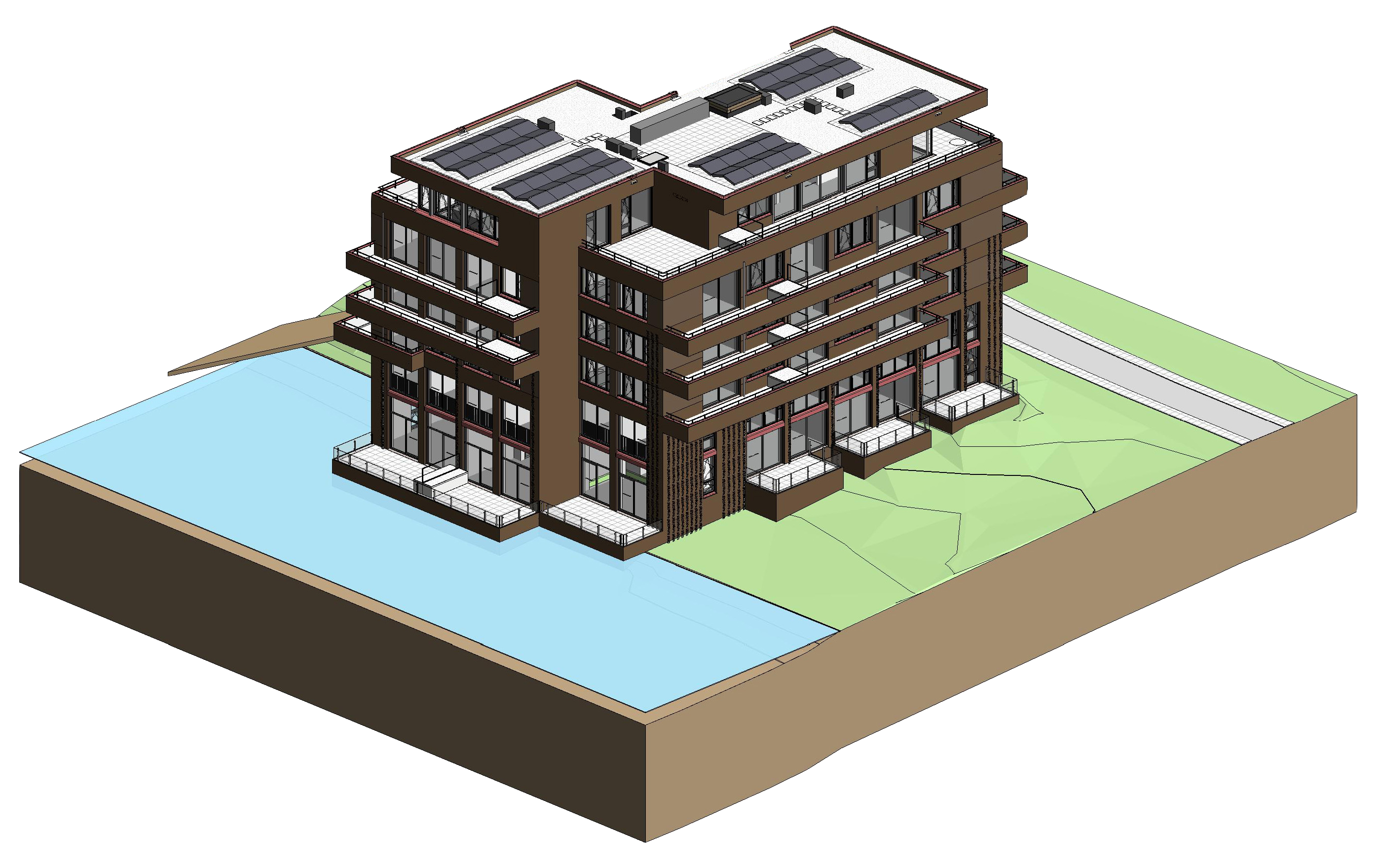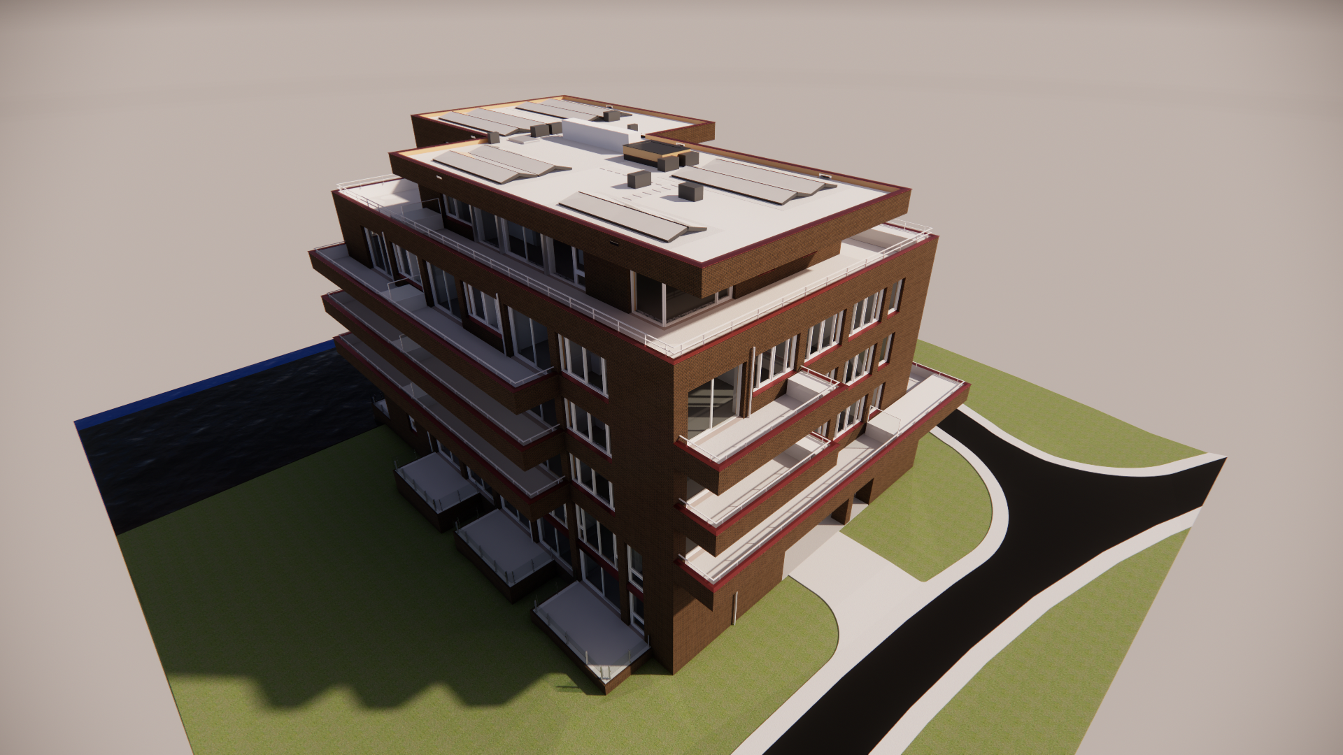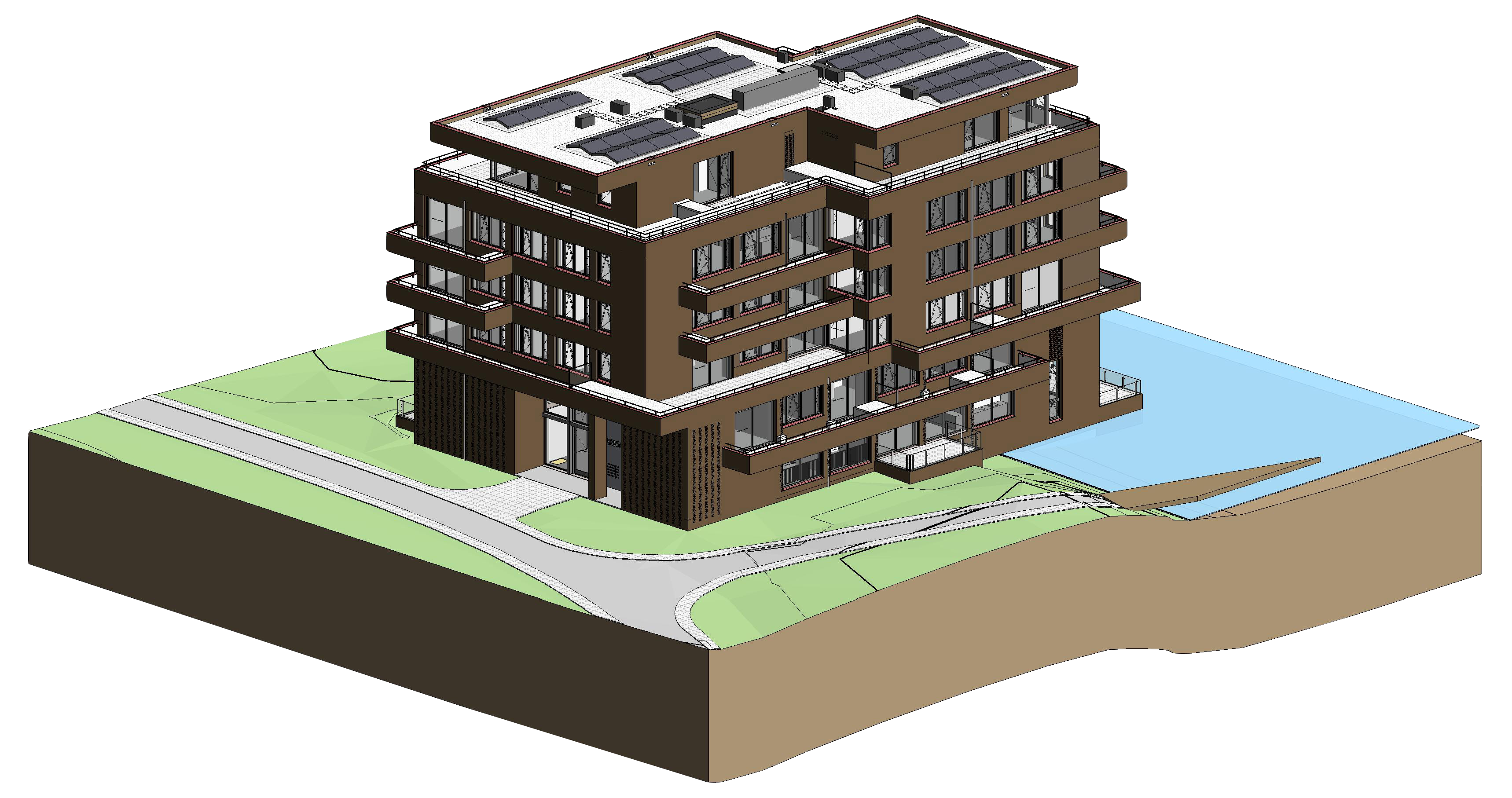 RU bouwdesign heeft het VO ontwerp in Revit BIM uitgewerkt. Het ontwerp kent op beganegrond niveau twee niveaus en de woningen hebben hier twee bouwlagen. Op alle overige bouwlagen hebben de appartementen één bouwlaag. De bovenste bouwlaag kent twee penthouse appartementen. Hoewel de tekenopdracht op DO niveau was, is de uitwerking bijna op TO niveau uitgewerkt.