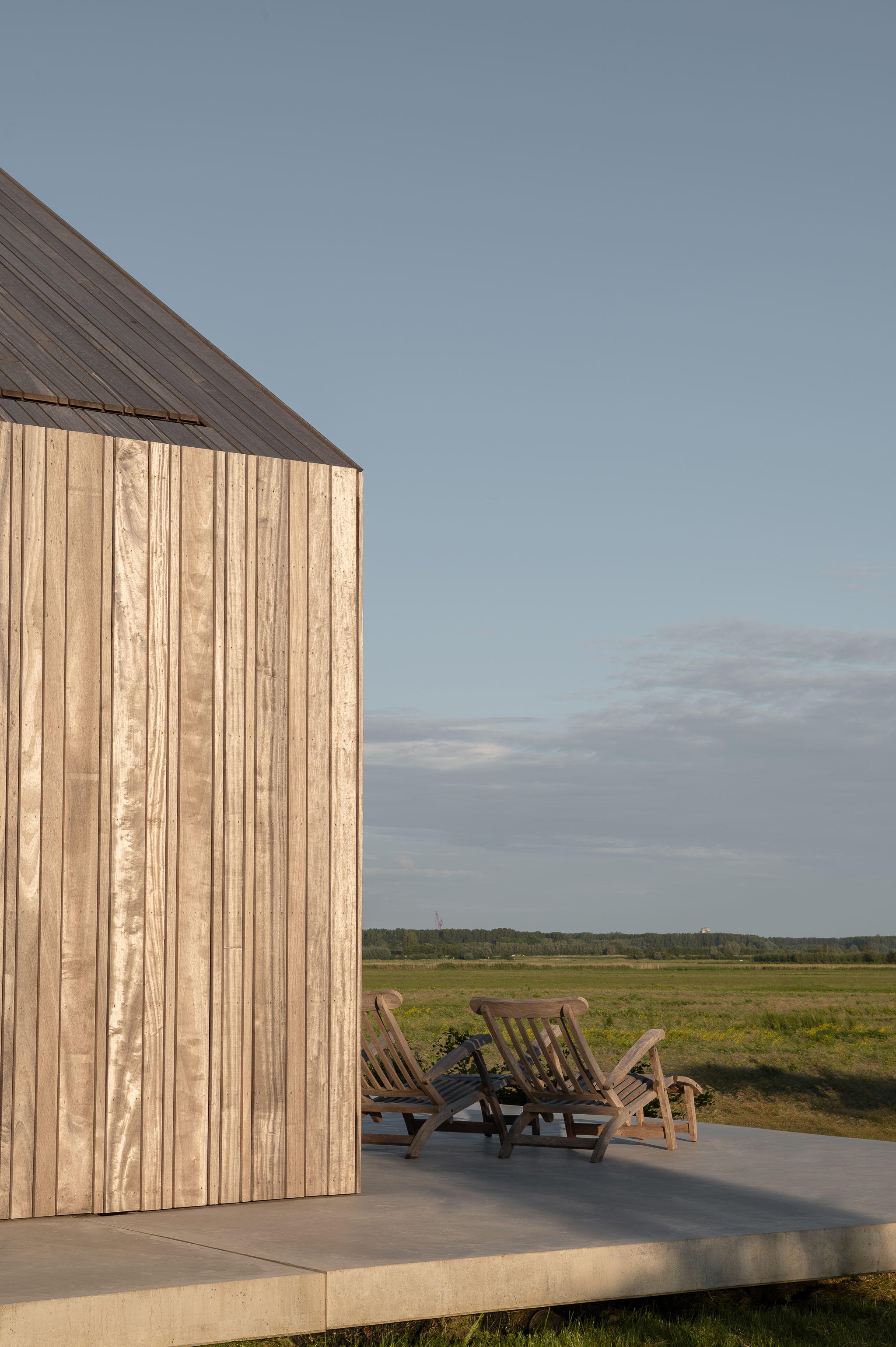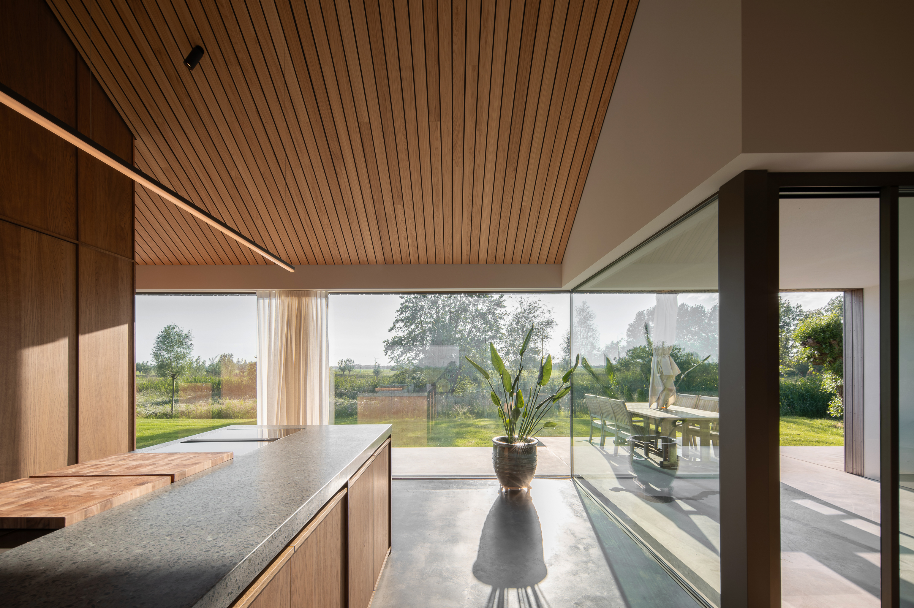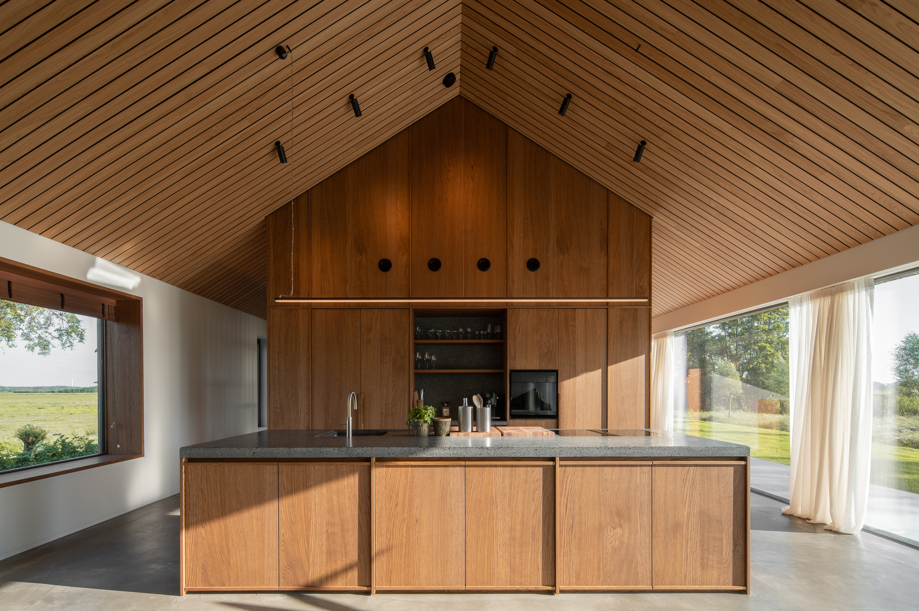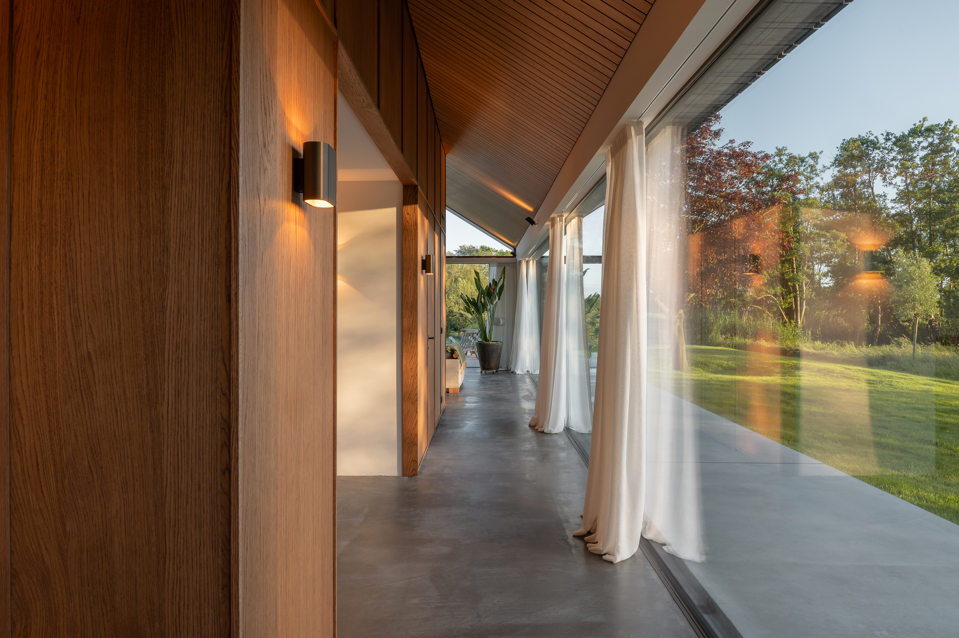 De bovenbouw is vormgegeven als een geëxtrudeerde tunnel, bekleed aan de buitenzijde met 3 maten Padoek houten delen. Een selectie nauwkeurig gemaatvoerde kleinere ramen zijn aan de zuidgevel geplaatst terwijl de noordgevel met grote glazen schuifpuien met openheid gericht is op de polder. Een hoogwaardige verdeling van meubelelementen en wanden verdelen de open leefruimte.