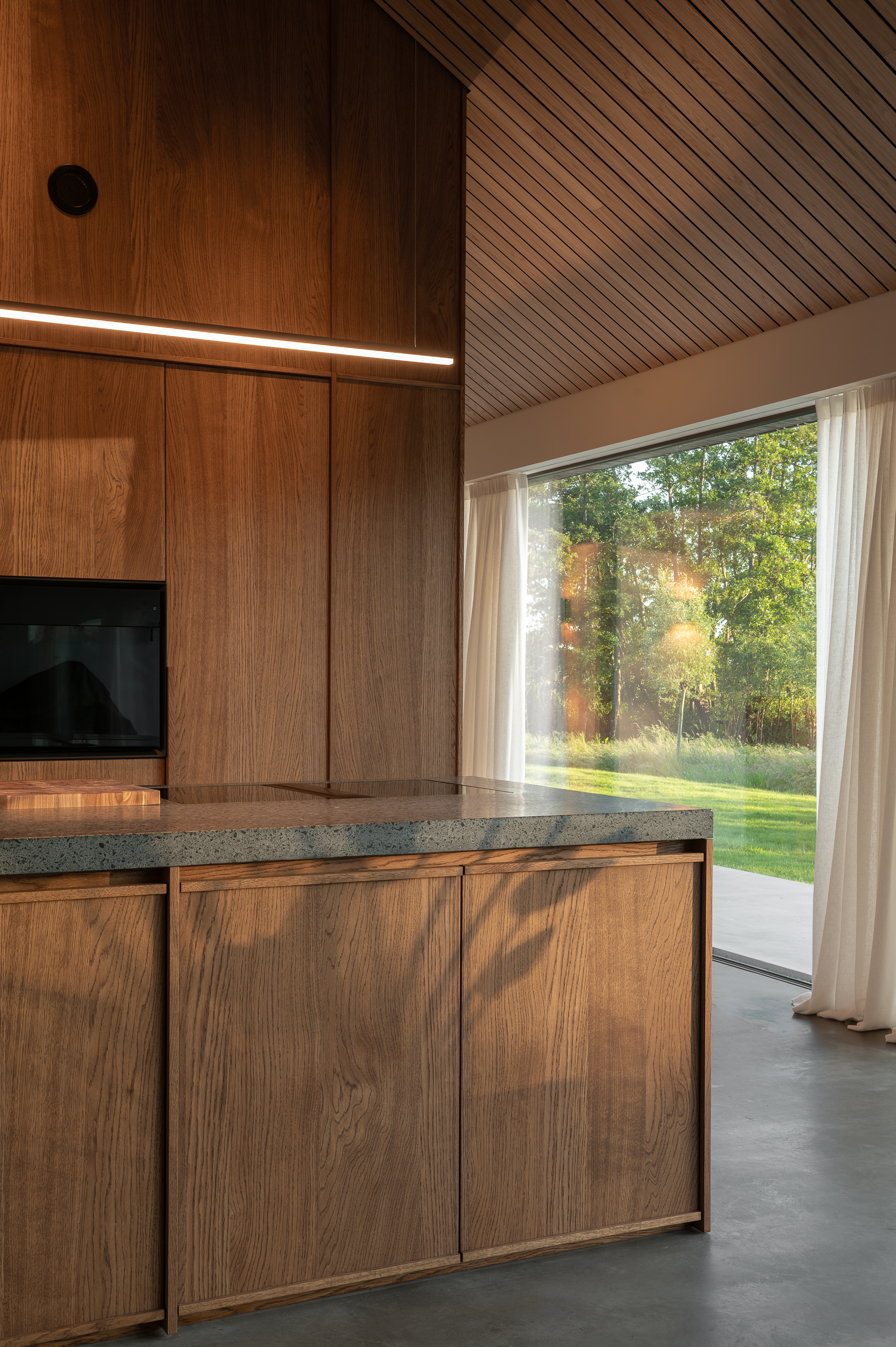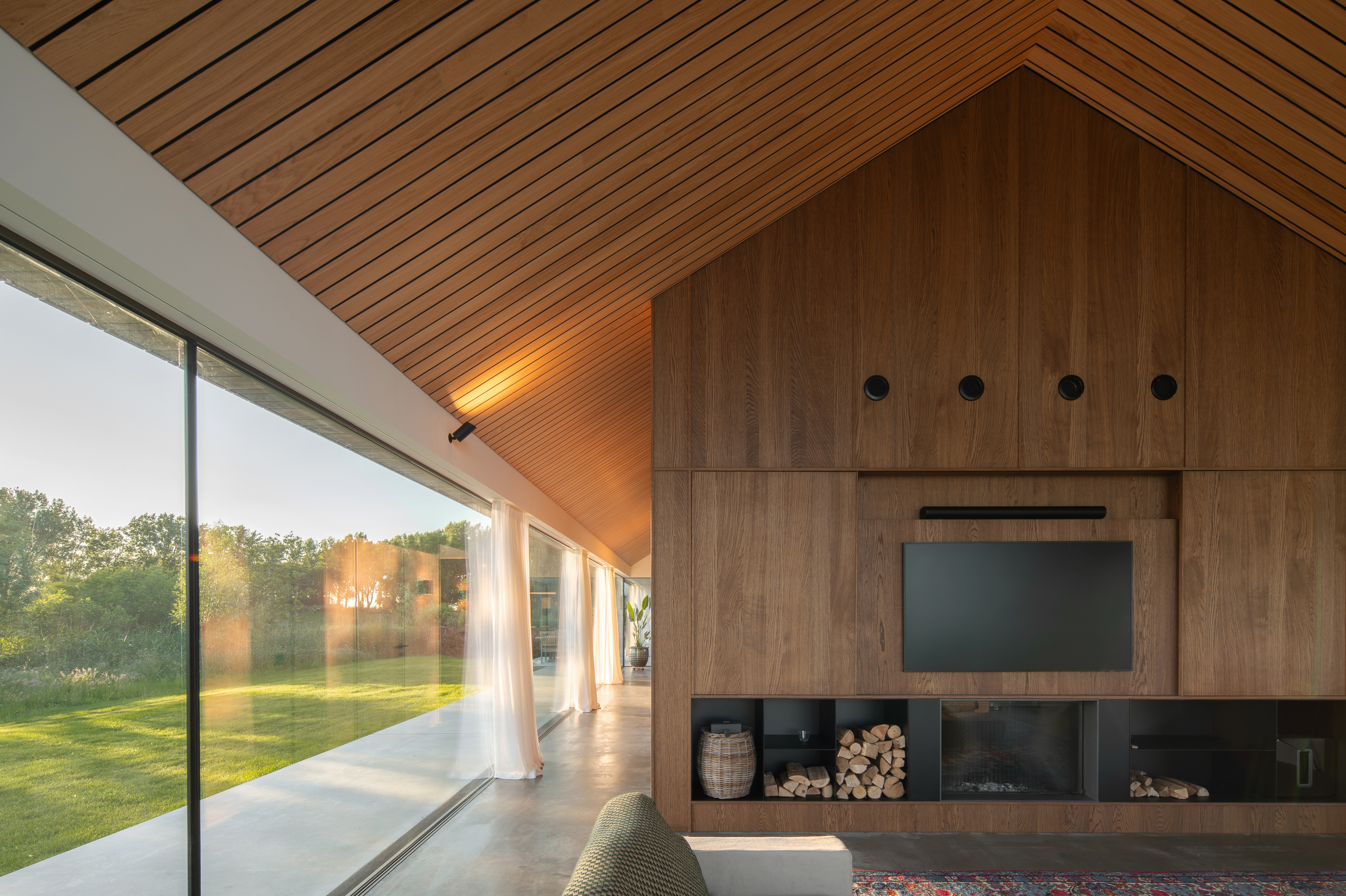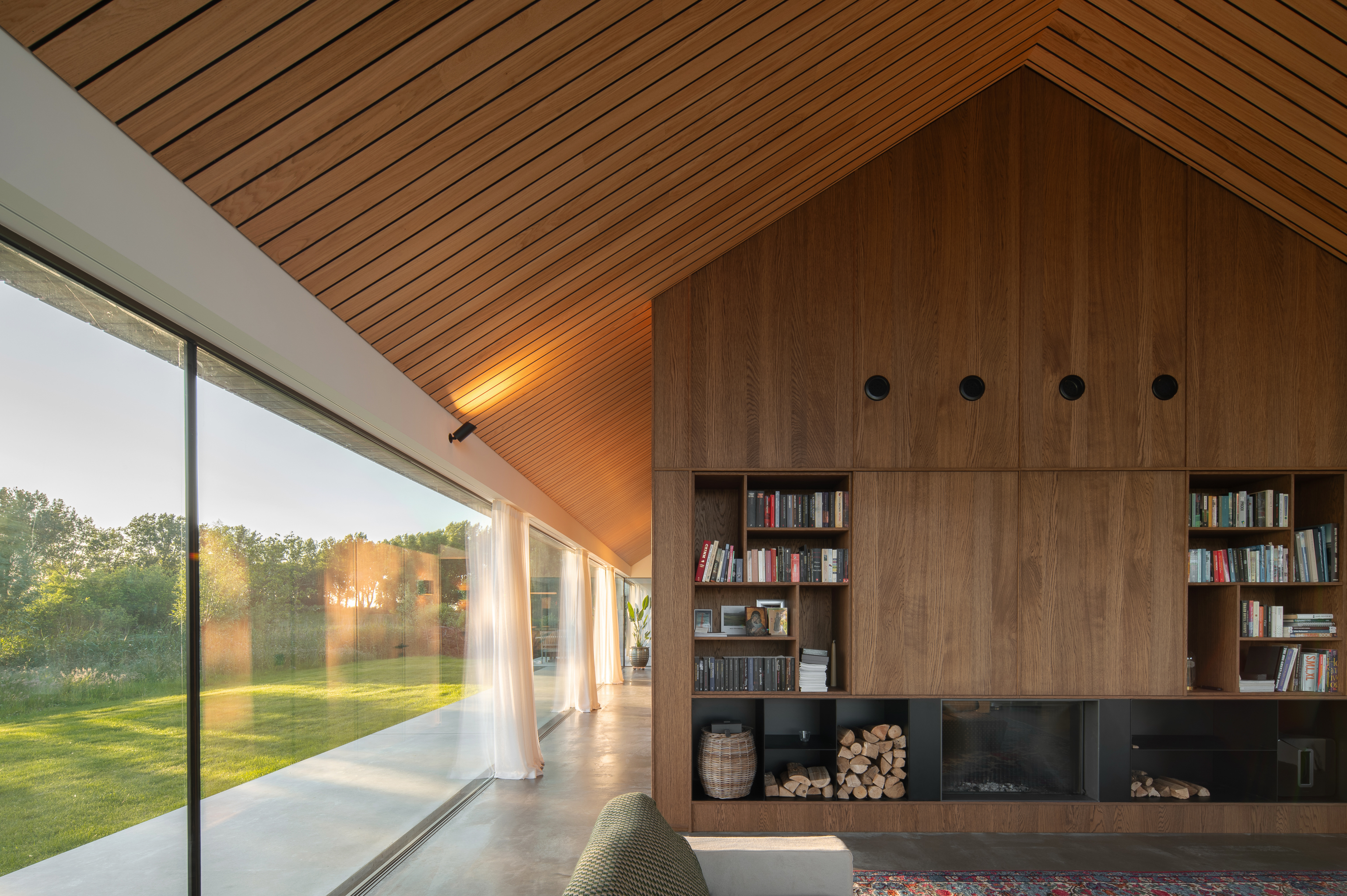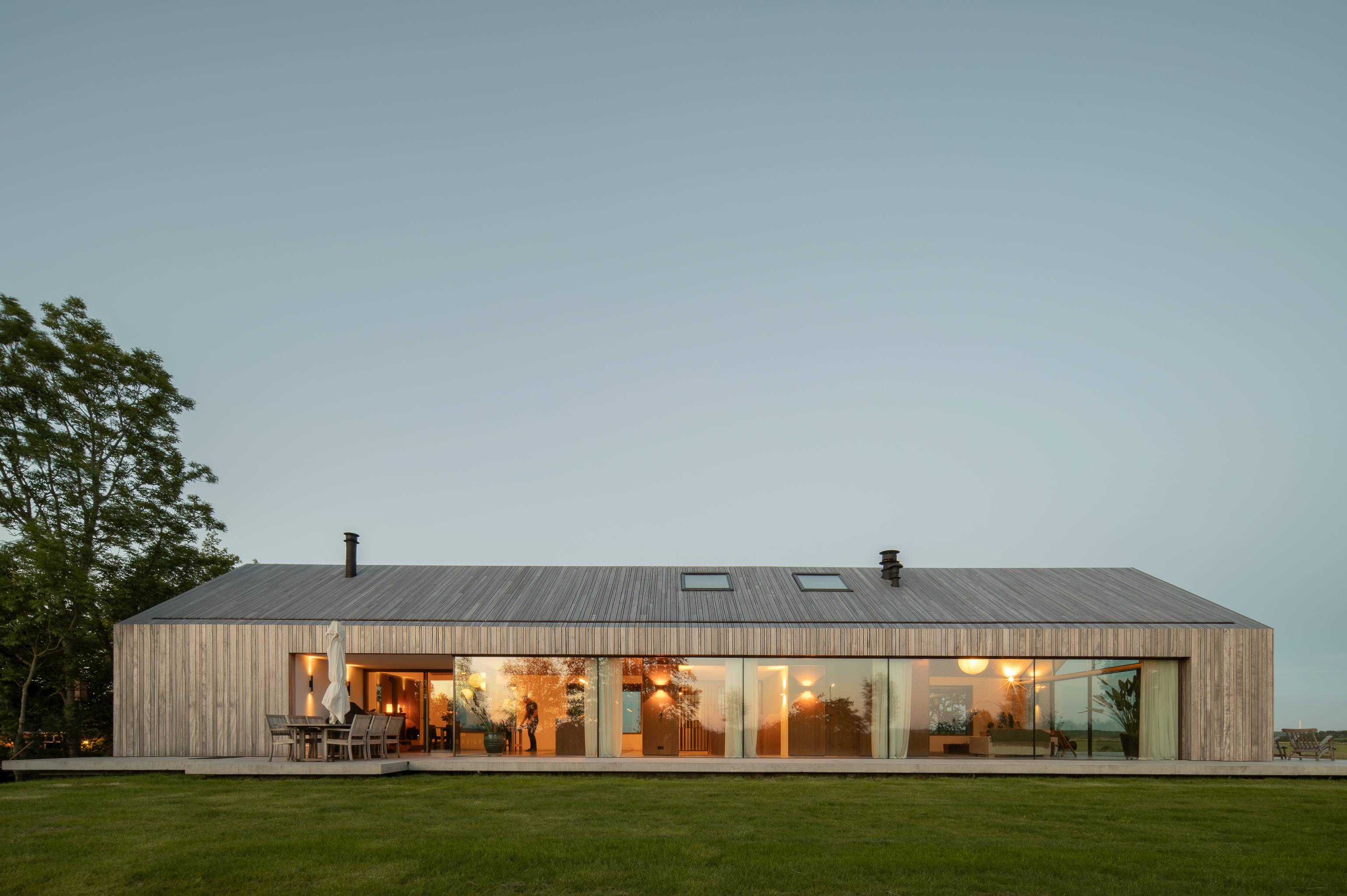 De bovenbouw is vormgegeven als een geëxtrudeerde tunnel, bekleed aan de buitenzijde met 3 maten Padoek houten delen. Een selectie nauwkeurig gemaatvoerde kleinere ramen zijn aan de zuidgevel geplaatst terwijl de noordgevel met grote glazen schuifpuien met openheid gericht is op de polder. Een hoogwaardige verdeling van meubelelementen en wanden verdelen de open leefruimte.
