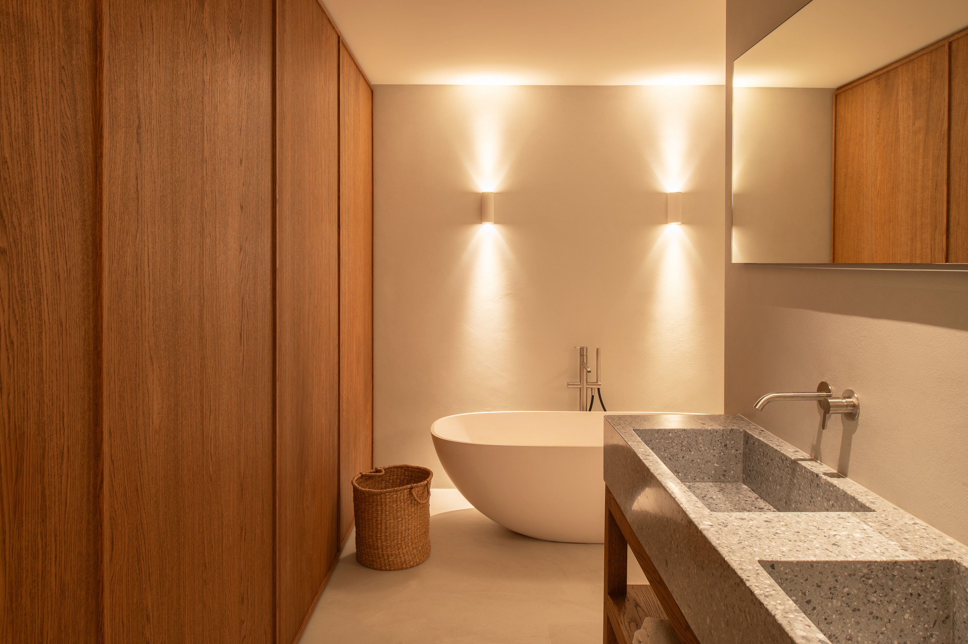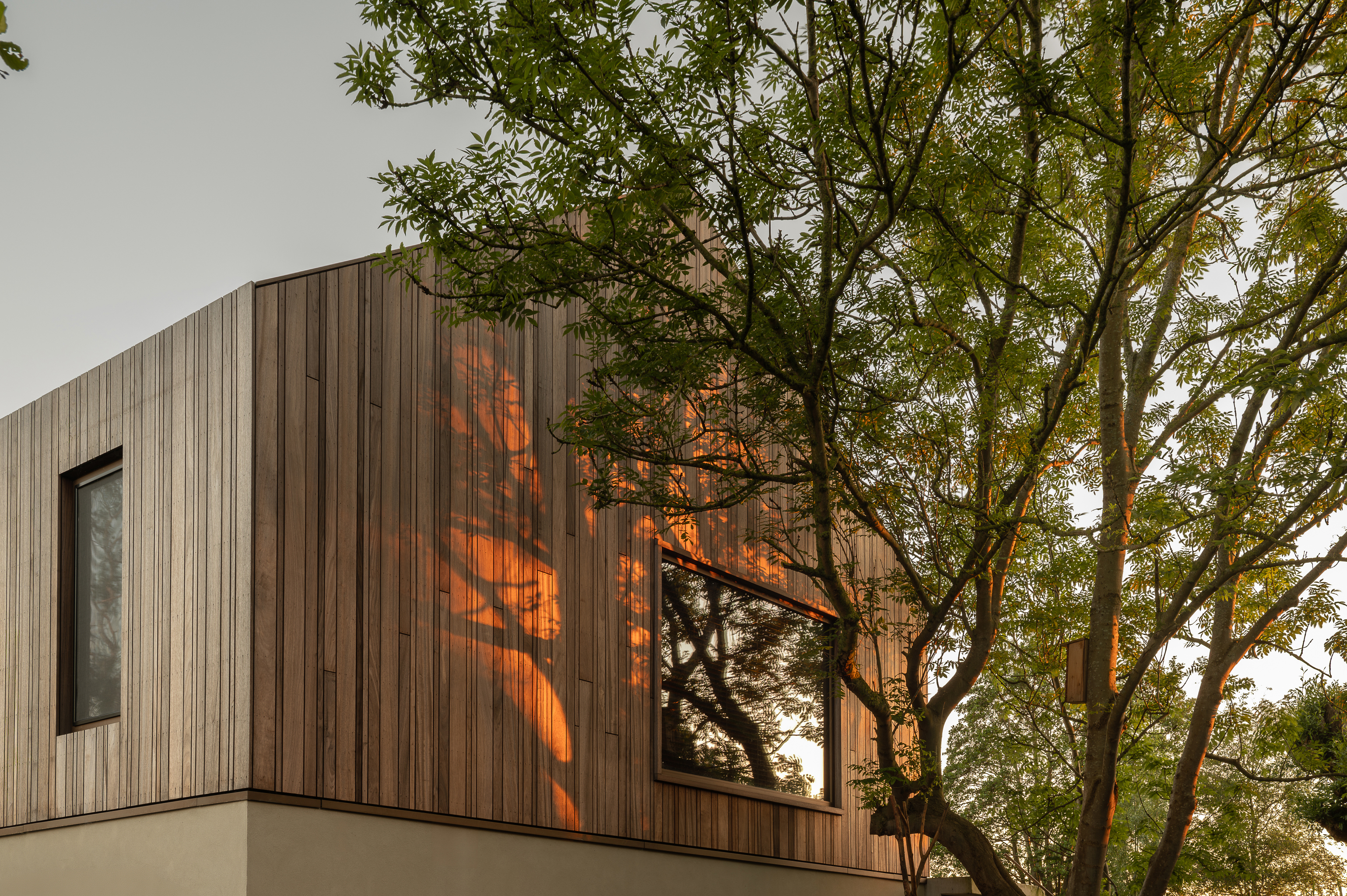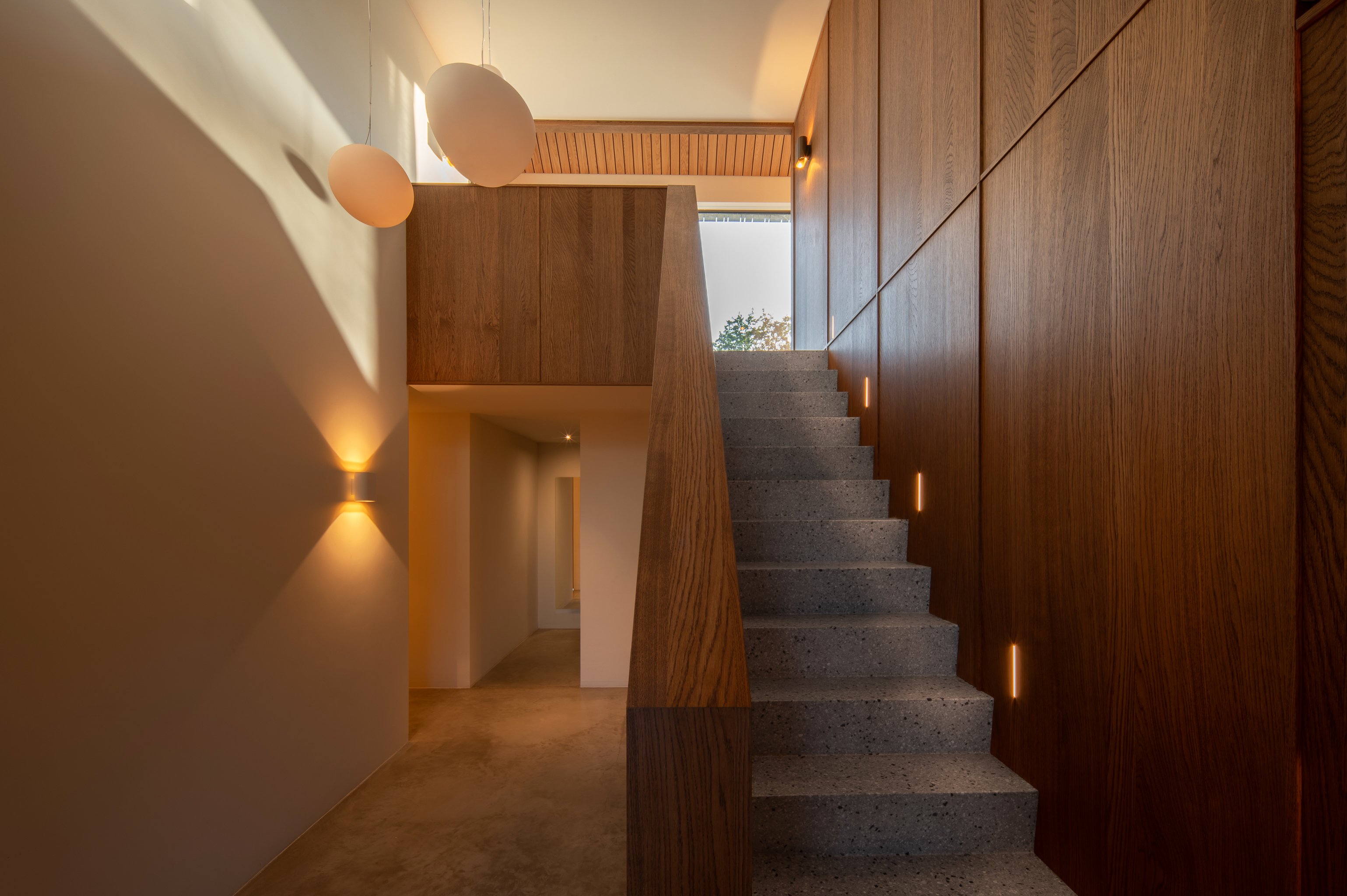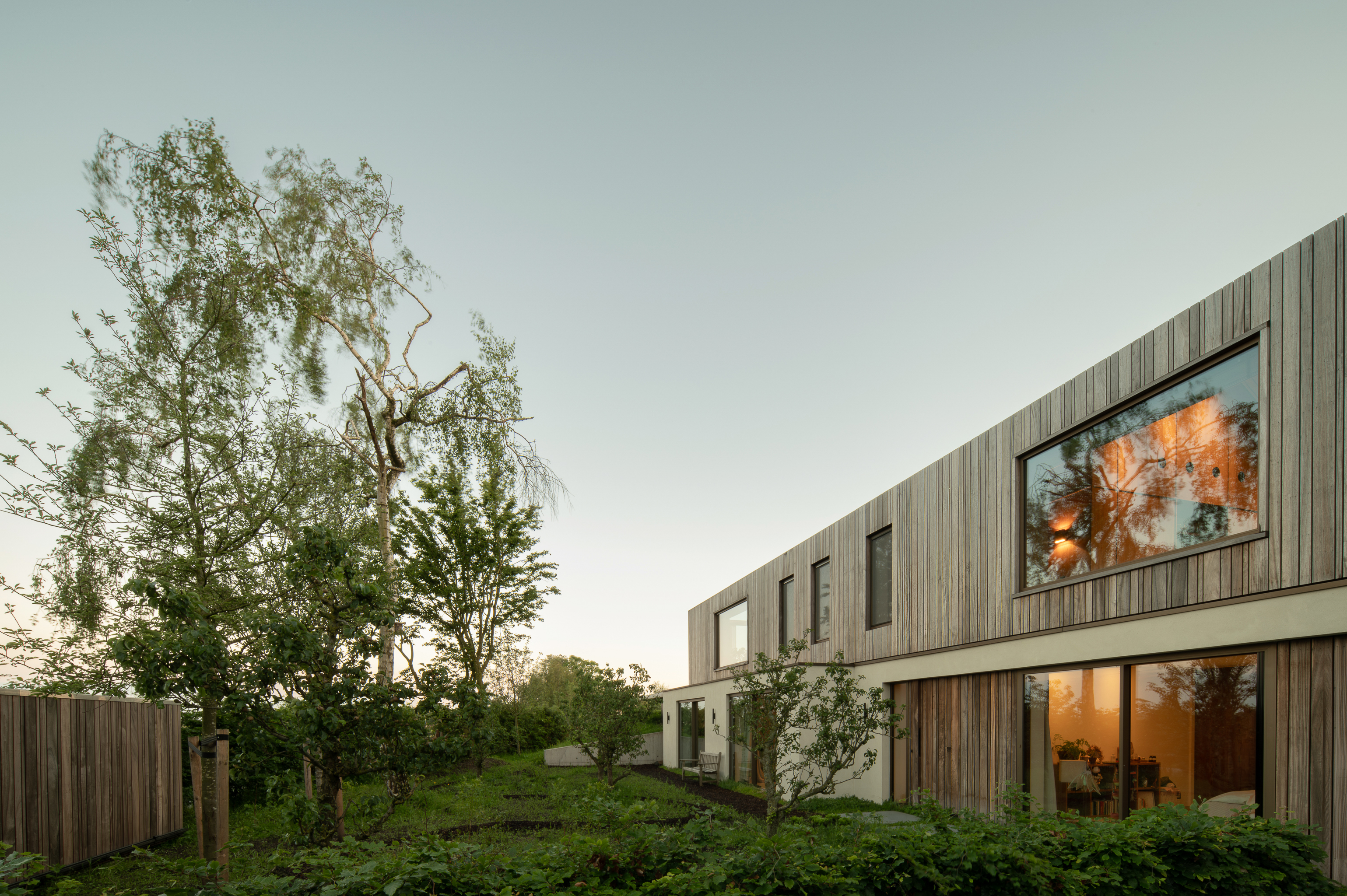 De bovenbouw is vormgegeven als een geëxtrudeerde tunnel, bekleed aan de buitenzijde met 3 maten Padoek houten delen. Een selectie nauwkeurig gemaatvoerde kleinere ramen zijn aan de zuidgevel geplaatst terwijl de noordgevel met grote glazen schuifpuien met openheid gericht is op de polder. Een hoogwaardige verdeling van meubelelementen en wanden verdelen de open leefruimte.