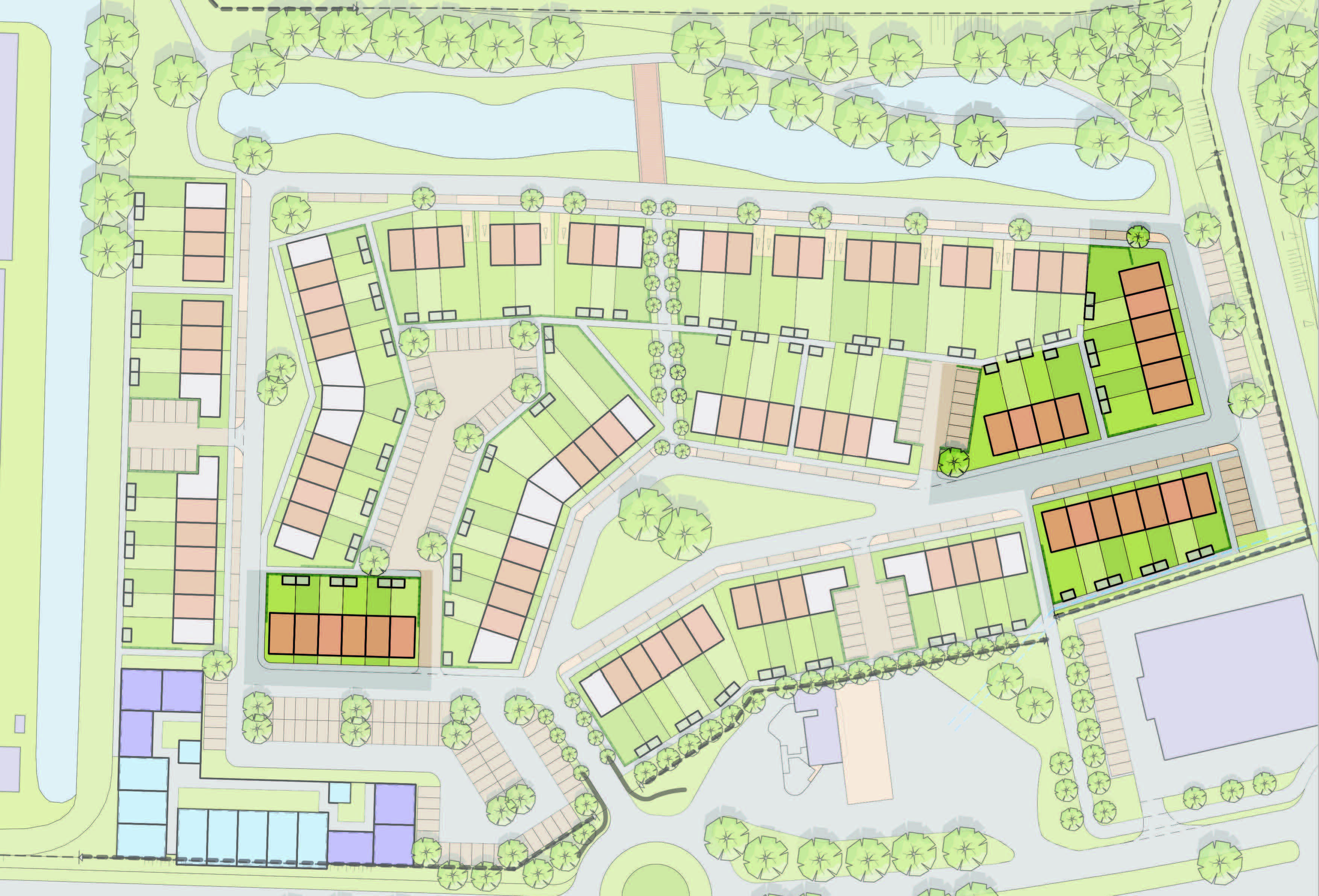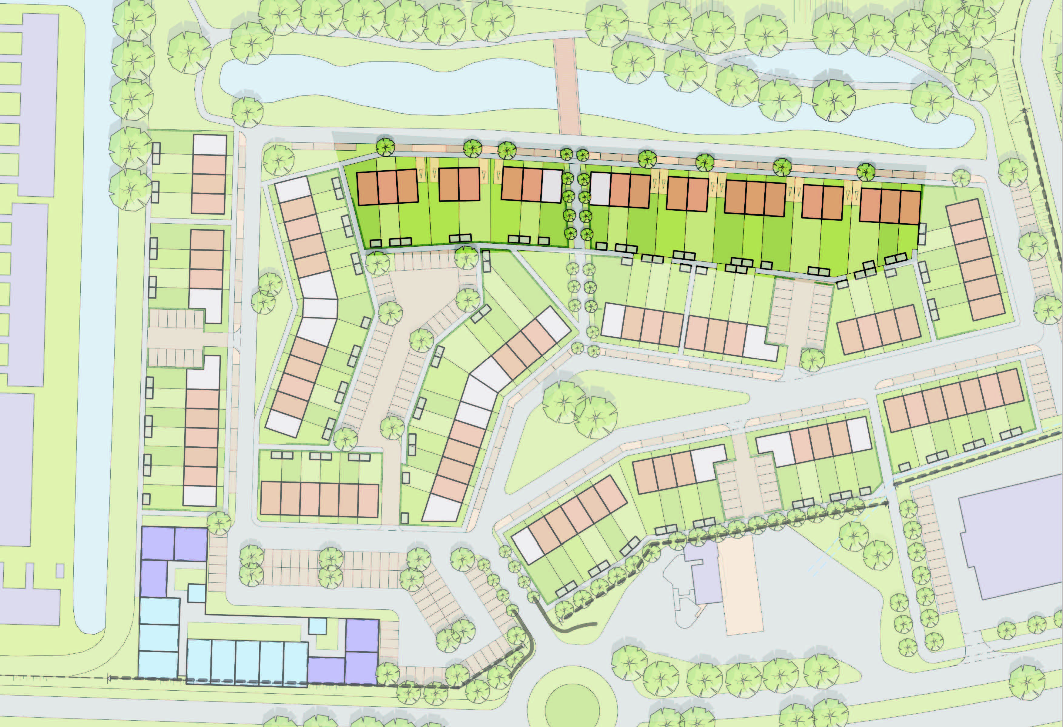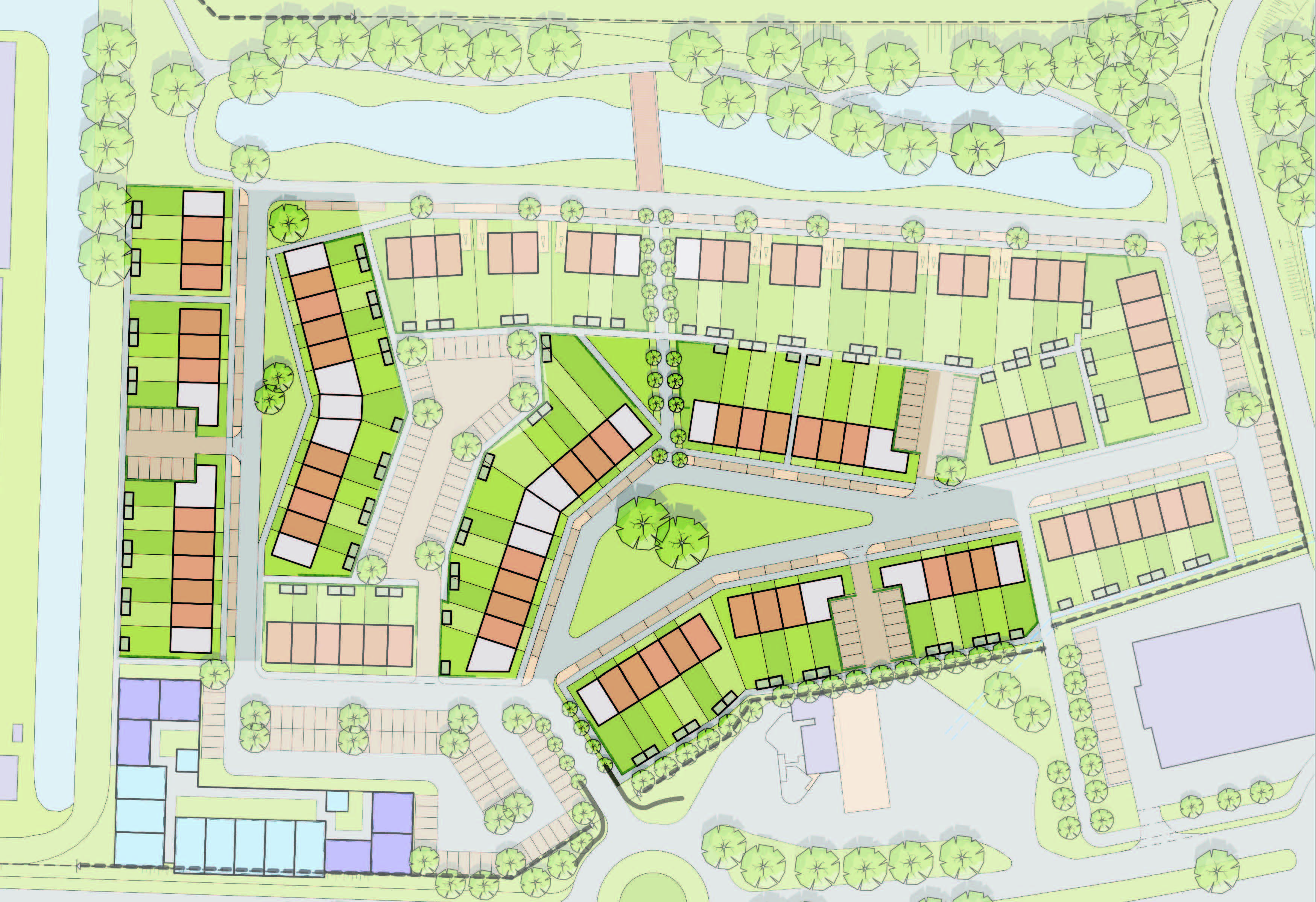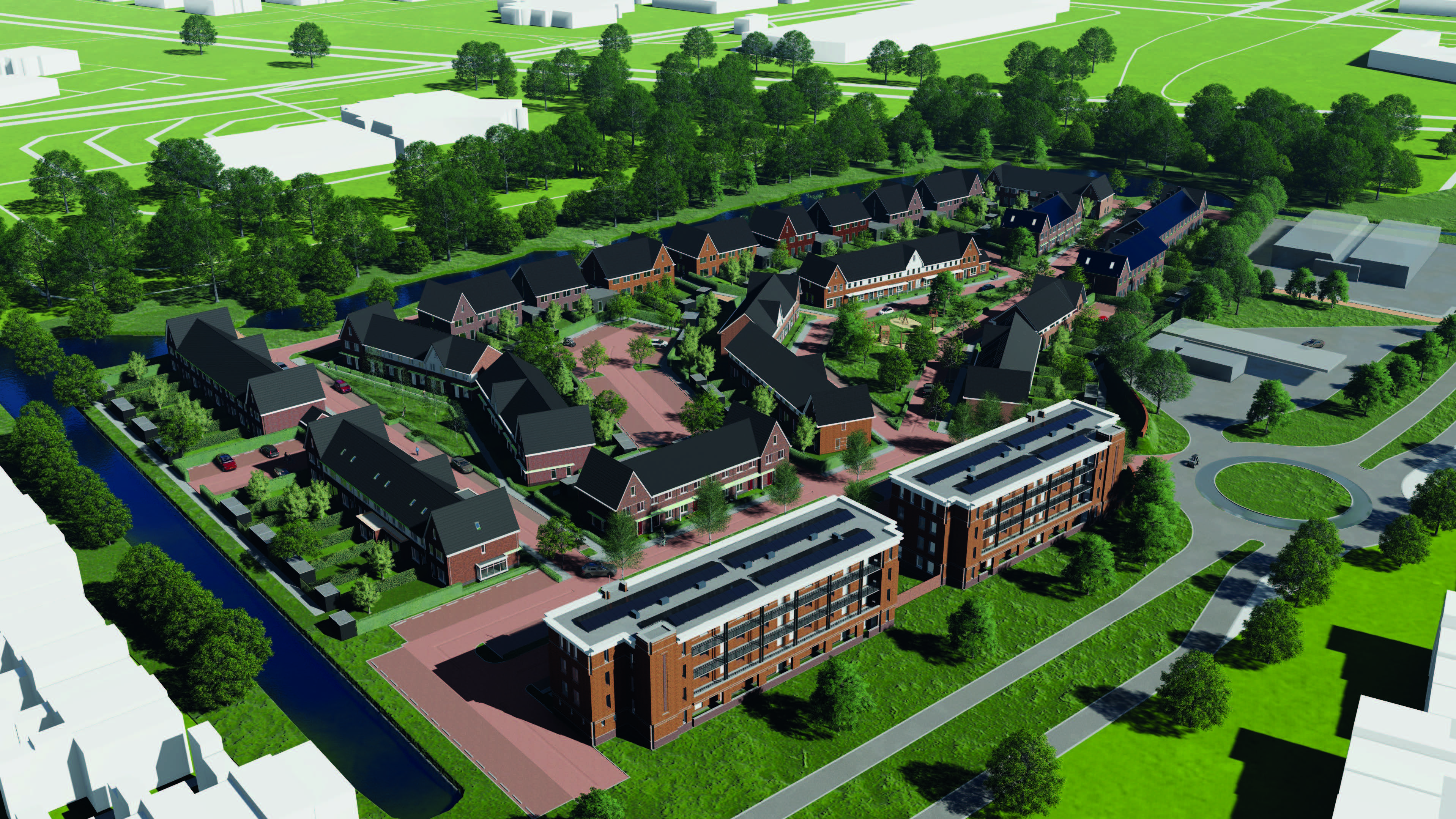 Het plangebied is verdeeld onder twee architecten waarbij 01-10 Architecten 56 woningen heeft ontworpen. Het ontwerp bestaat uit drie ontwerpdelen - Pleinwonen, Tuinwonen en Parkwonen. De verschillenmde ontwerpen hebben een jaren-50 thema met een rijke architectuur met accenten als metselwerk lagen, betondorpels, gootoverstekken, luifels, dwarskappen, erkers en uitbouwen. RU bouwdesign heeft het ontwerp op DO niveau gedetaileerd uitgewerkt in 3D.